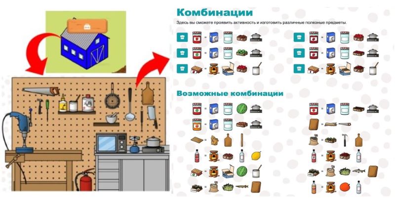 Комбинации показывают, что вы можете сделать, и что для этого нужно: пустая банка, бутылка, проволка или что-то еще с рынка. Новые продукты можно продавать. Секретный совет: не продавайте все подряд, это может пригодиться вам позже.