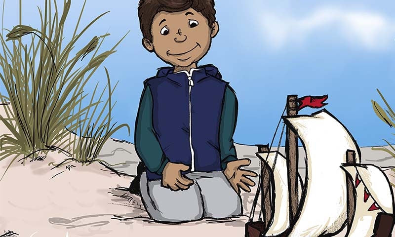 С гордостью он направился со своей парусной лодочкой к берегу и спустил её на воду.