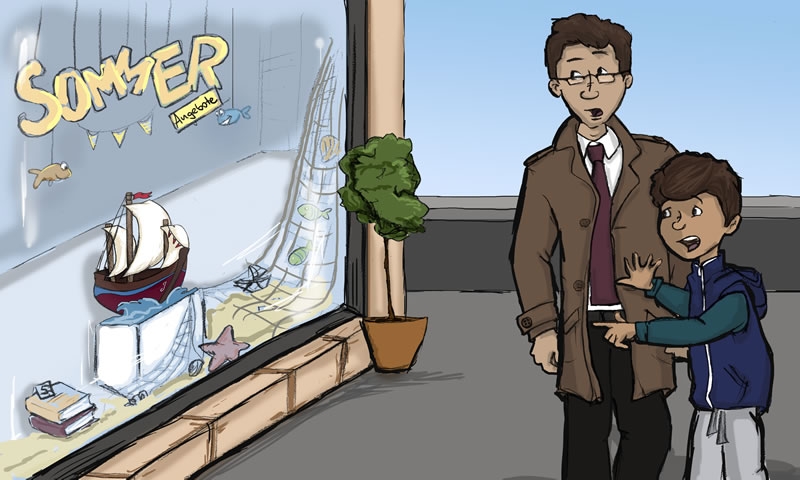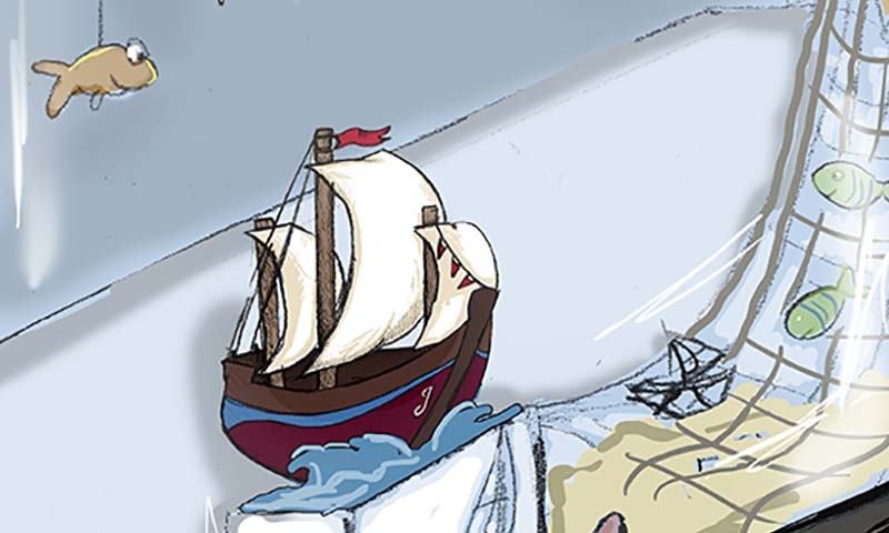 Женя побежал к продавщице магазина: "Это не ваш парусник, он мой".