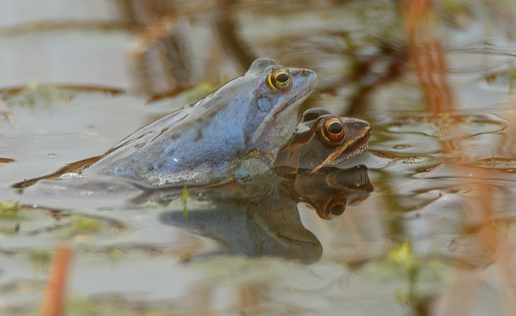 Если ты прогуливаешься по водной равнине в конце марта - начале апреля, у тебя есть шанс наблюдать уникальное чудо: в некоторых районах коричневые самцы болотных лягушек во время нереста становятся синими.